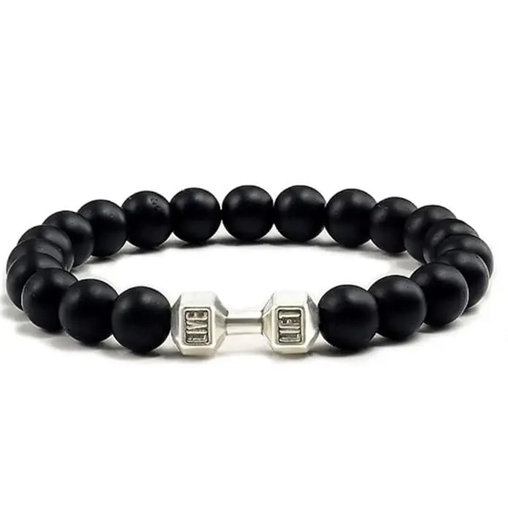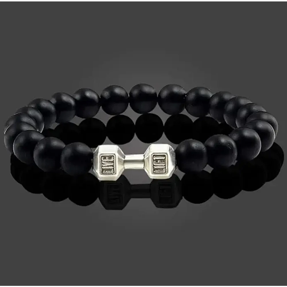 Black Matte Agate Onyx Beads Bracelet Pack of 2 | LIVE LIFT Fitness Dumbbell Charm Bracelet | Unisex Gym & Gift Jewelry
