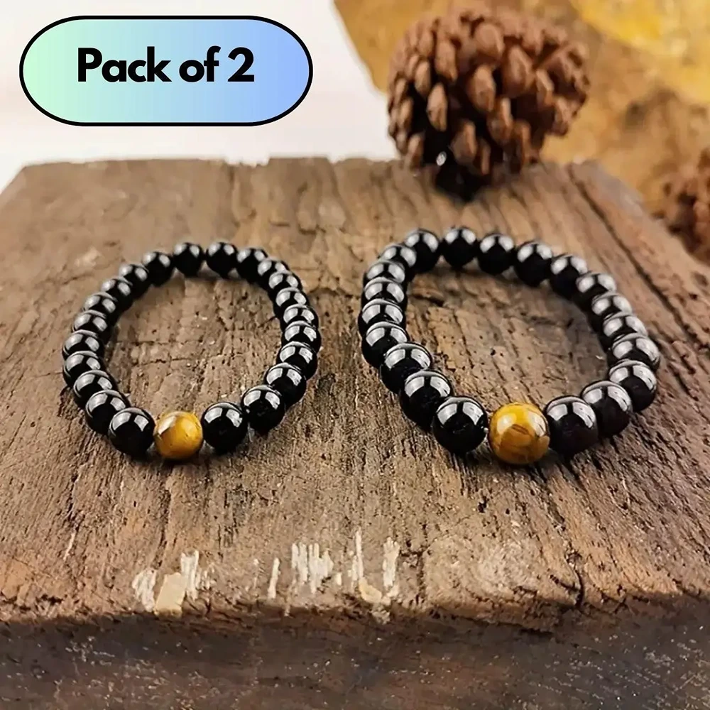 Crystal Black Tourmaline Bracelet Pack of 2 | Tiger Eye Stone Energy Healing Beads | Unisex Crystal Jewelry for Protection & Wellness
